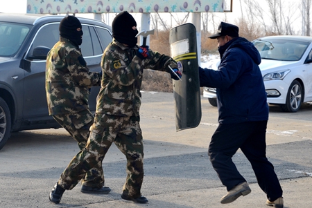 • 聚酯公司 張曉峰 “報告,前門發(fā)現(xiàn)可疑人員手持棍棒、刀具,我已按響一鍵報警器報警,請求支援?!碑旈T衛(wèi)班長張志敏持對講機匯報。 近日,藍山屯河聚酯公司展開反恐應急預案演練。本次演練模